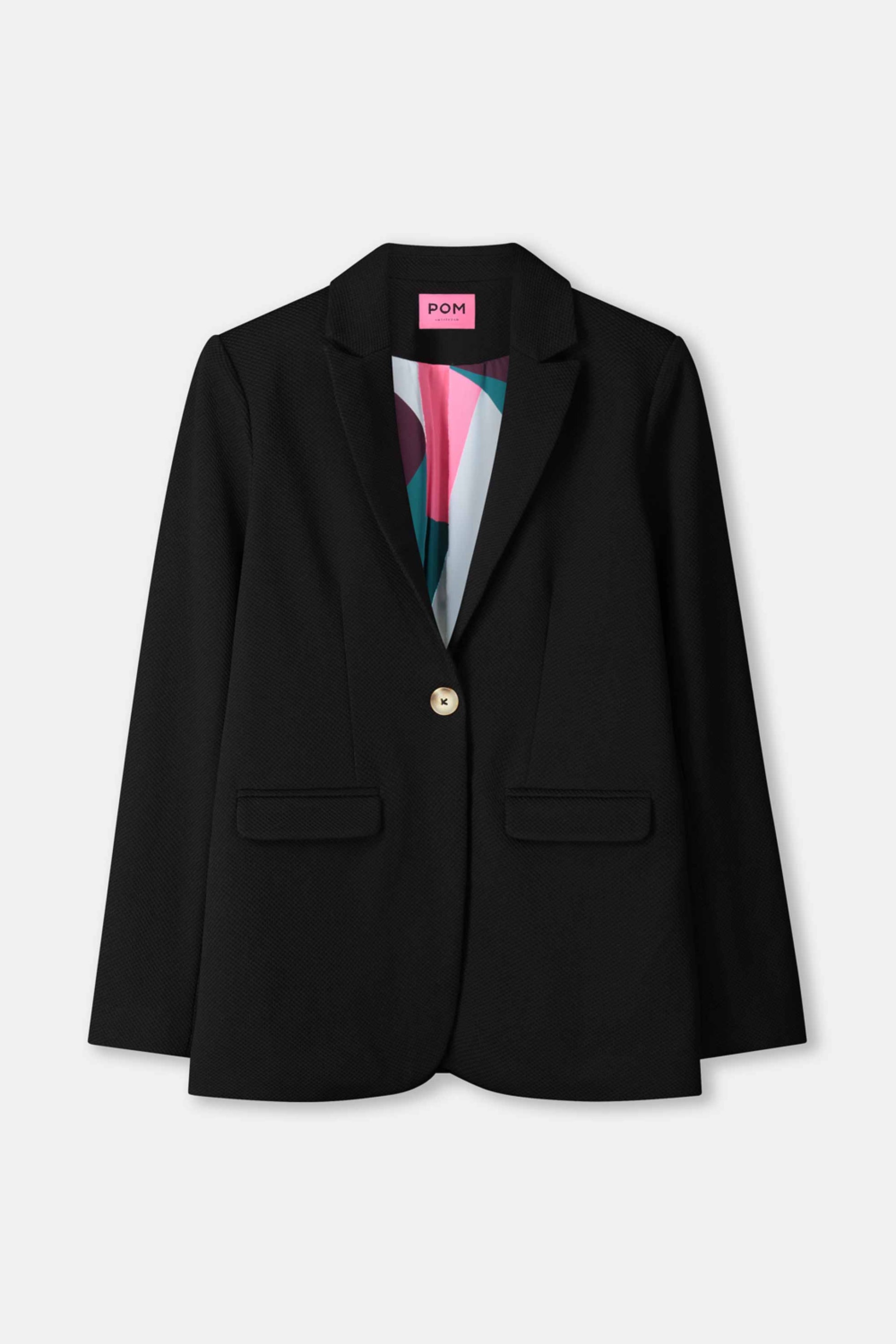 De blazer valt recht en komt tot over de heup. Het model op de foto is 179 cm en draagt maat 36.