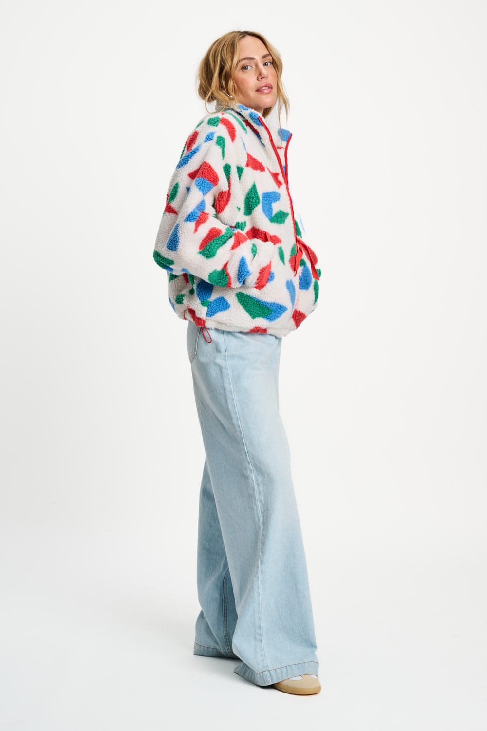 • Witte teddy jacket met koraalrode, groene en blauwe vlakken