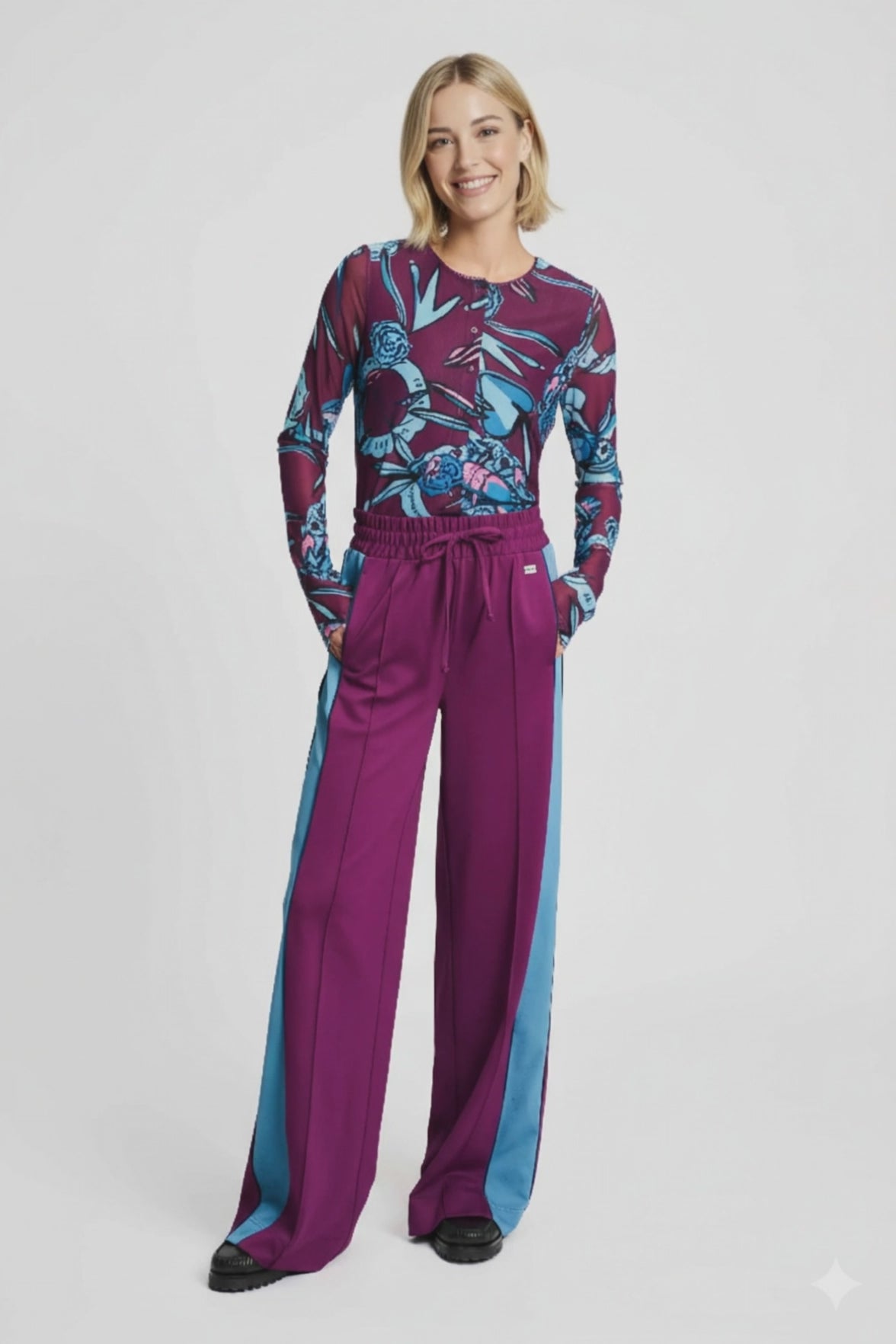 Deze colourblock trackpants in wijnrood met lichtblauw heeft een sportieve snit met een vleugje flair.