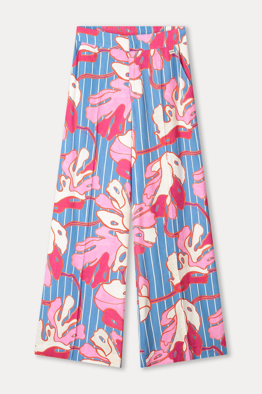 • Blauw-wit gestreepte broek met roze bloemenprint