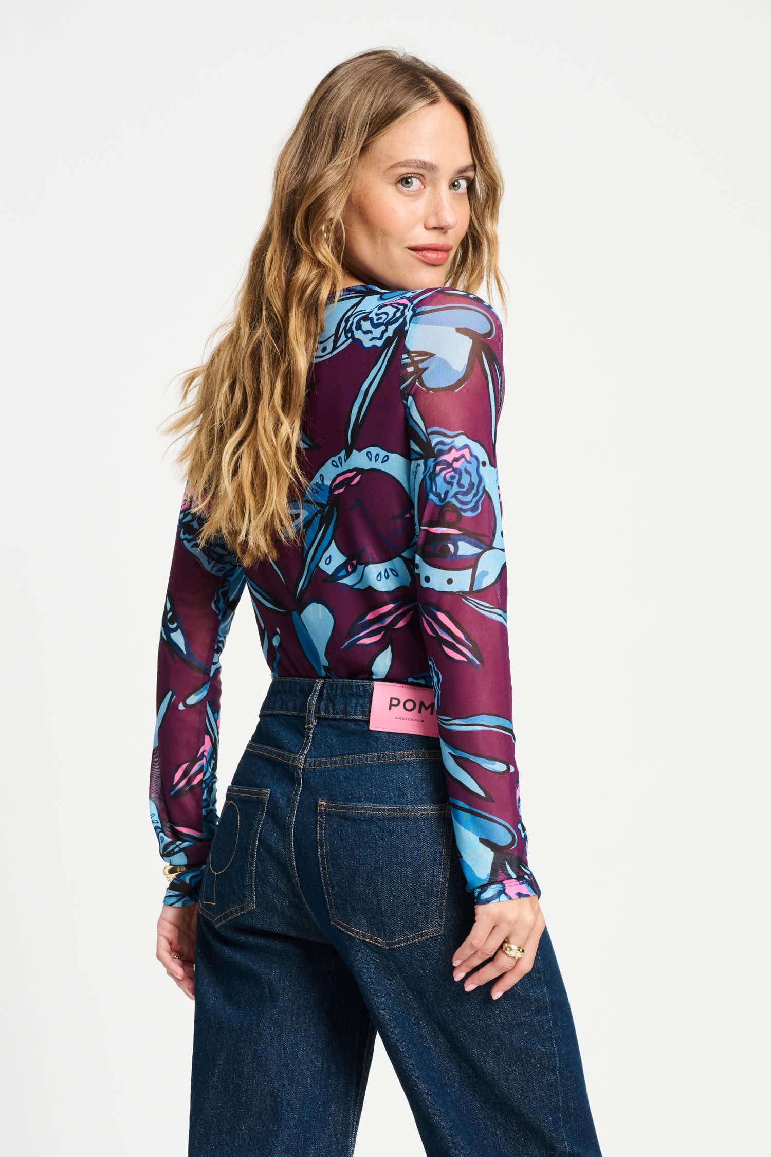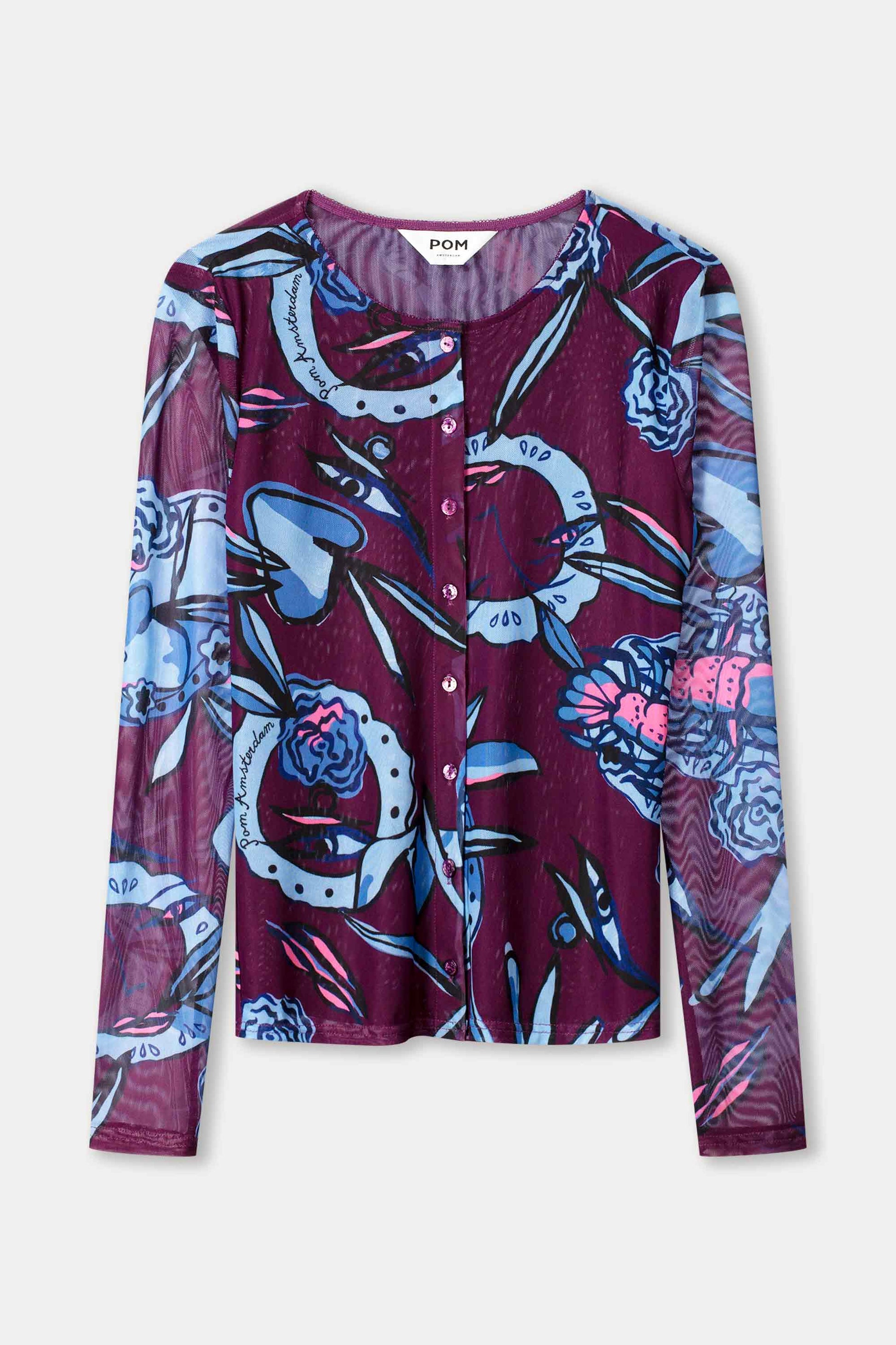 Deze wijnrode top met lichtblauwe 'dinner' print is een fijne aanvulling in je garderobe. Draag de top overdag met jeans of ’s avonds met een rok voor diner-proof glamour.