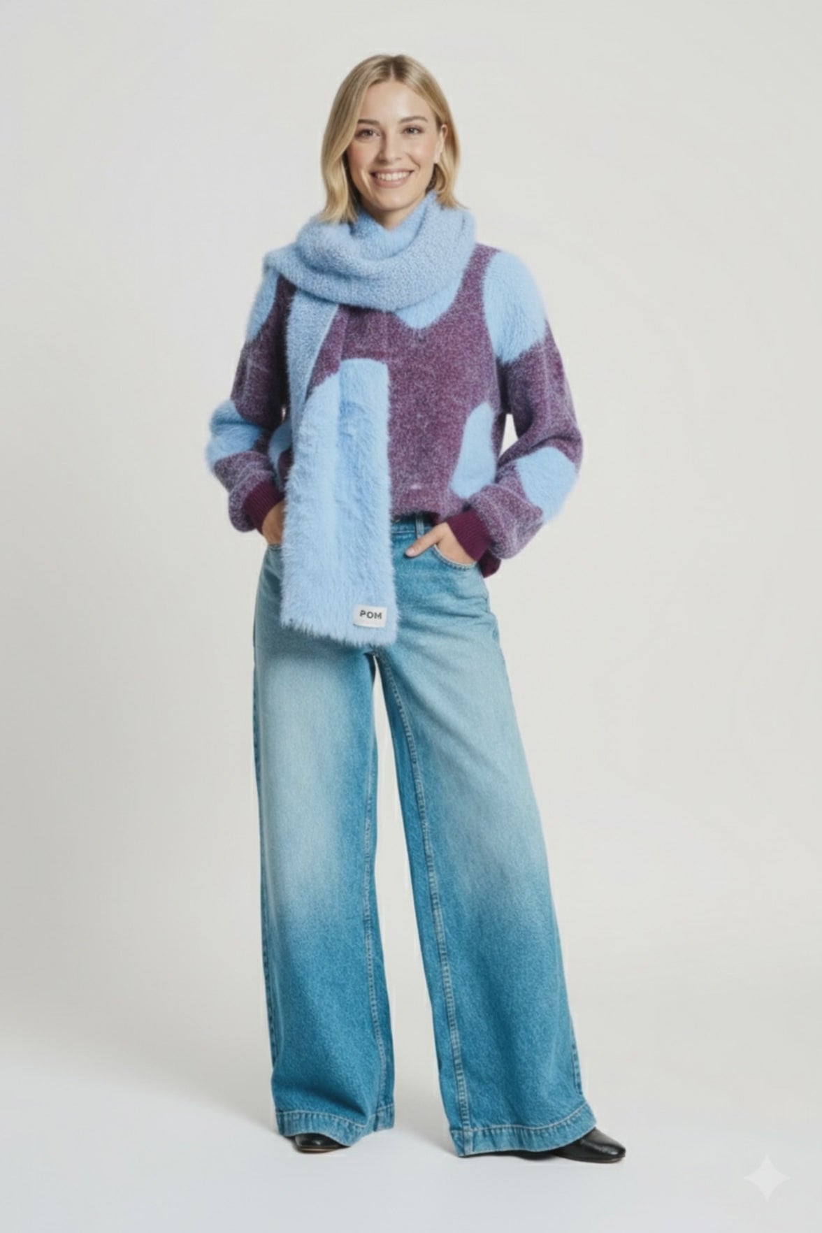 Deze superzachte plumkleurige pullover met grote blauwe dots brengt vrolijkheid en comfort samen in één statement piece. Combineer de trui met een jeans of pantalon voor een opvallende everyday look.
