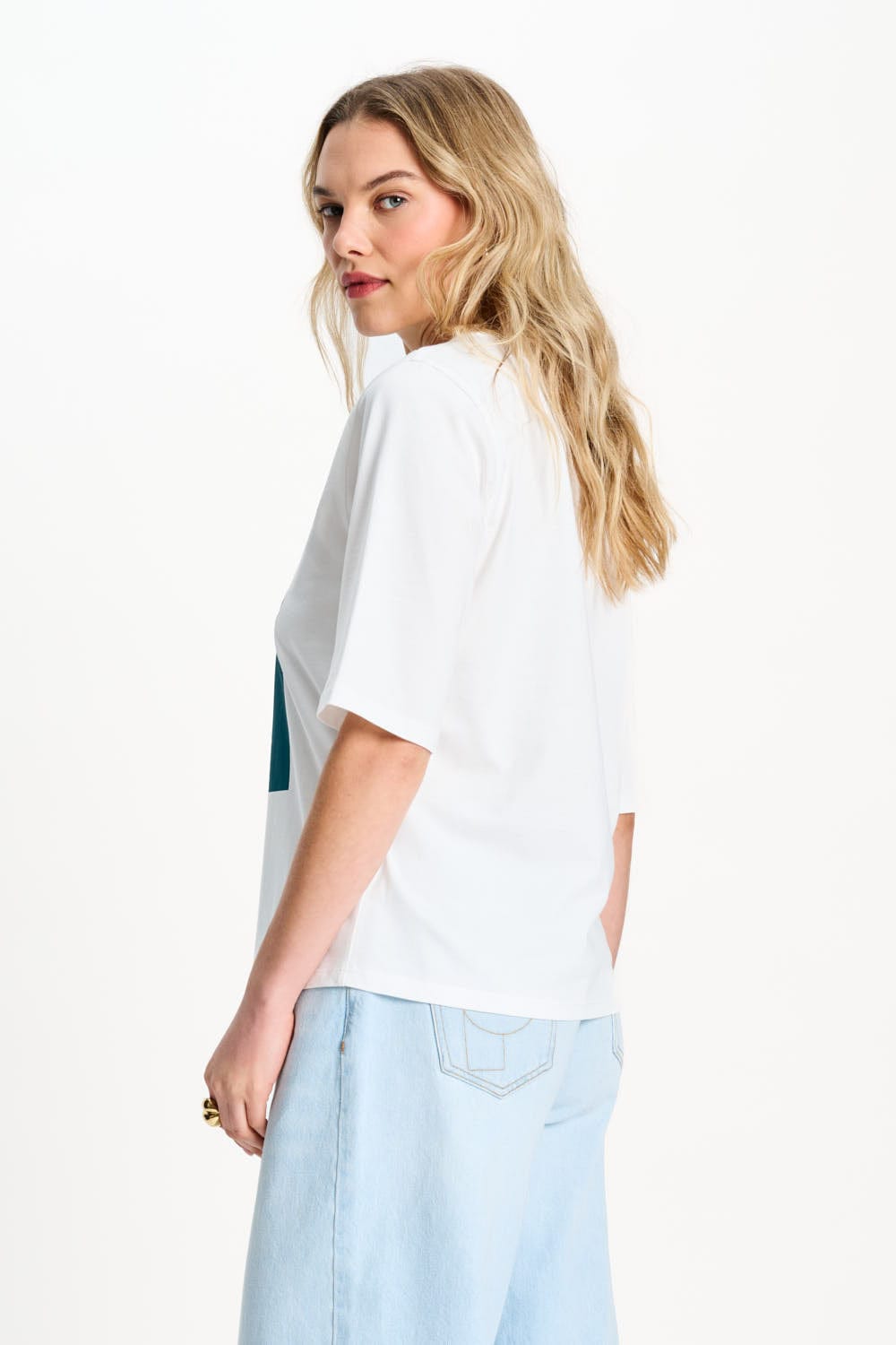 Pasvorm: Het T-shirt heeft een wijde pasvorm en korte mouwen. Het model op de foto is 175 cm lang en draagt maat 36.